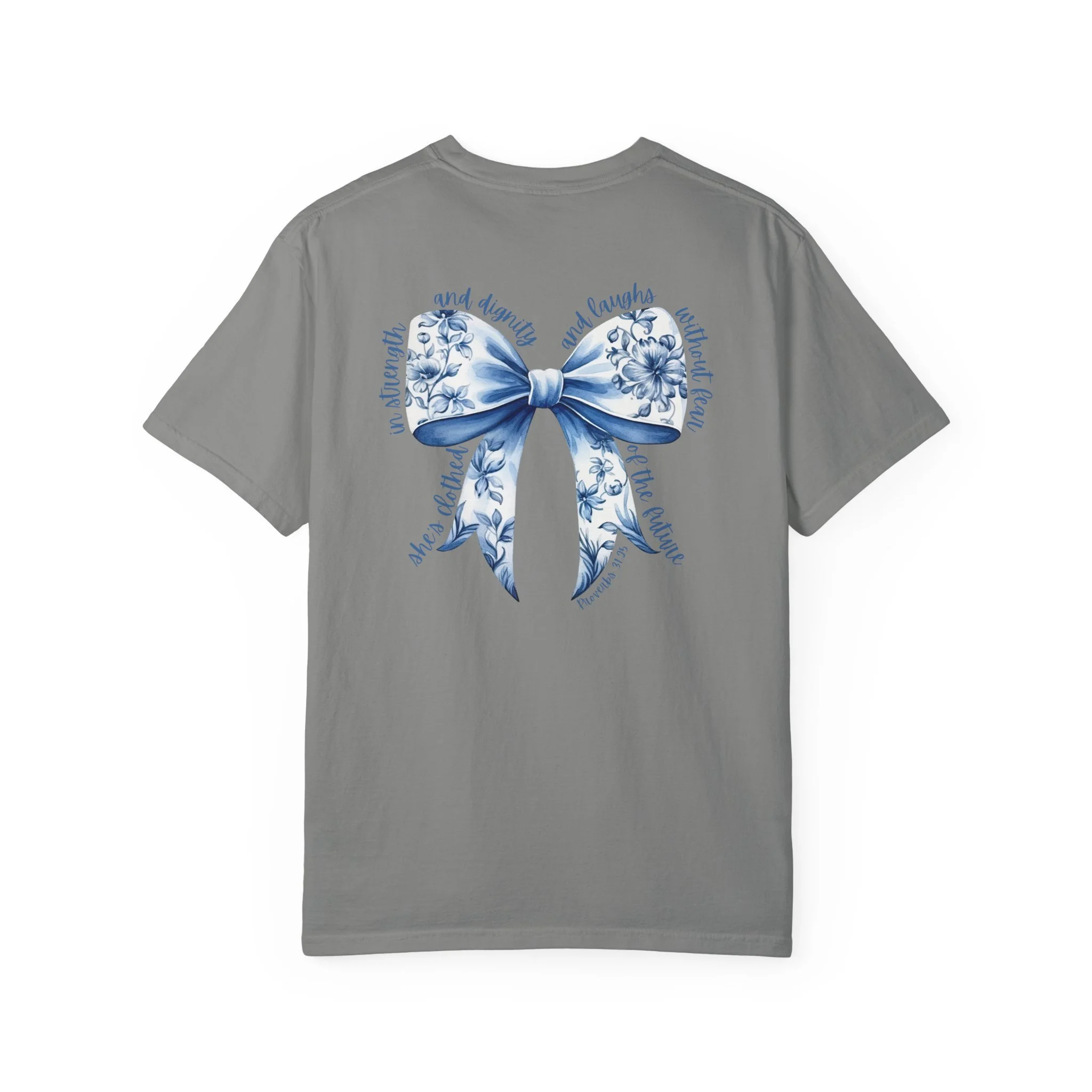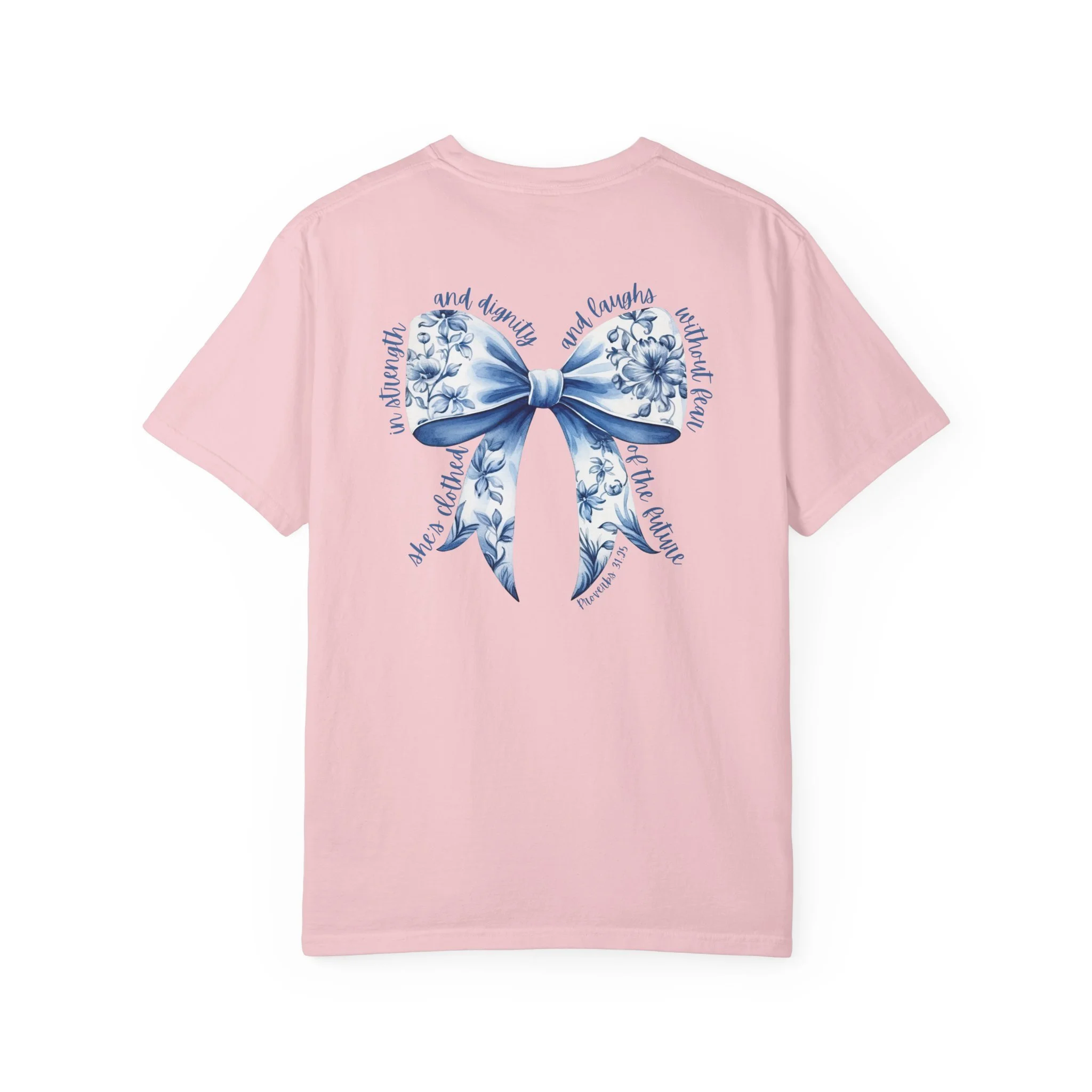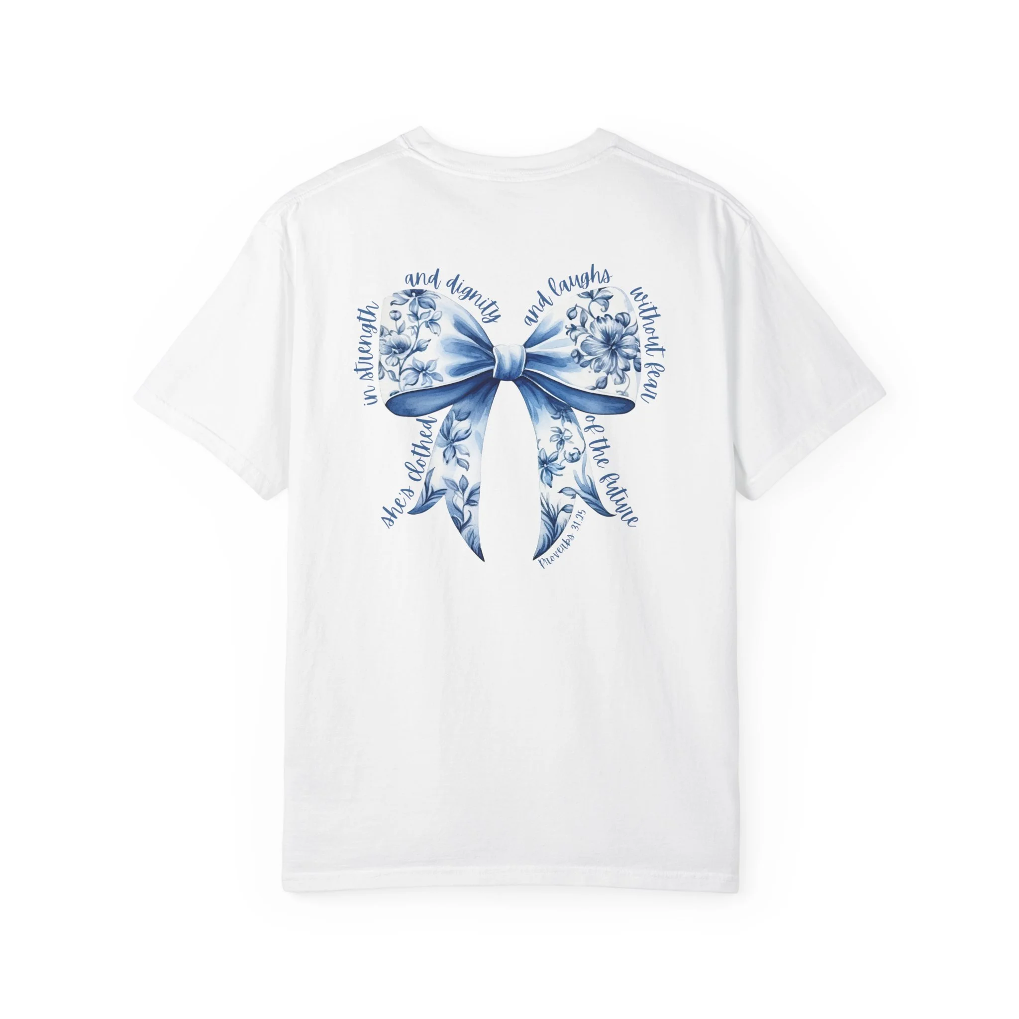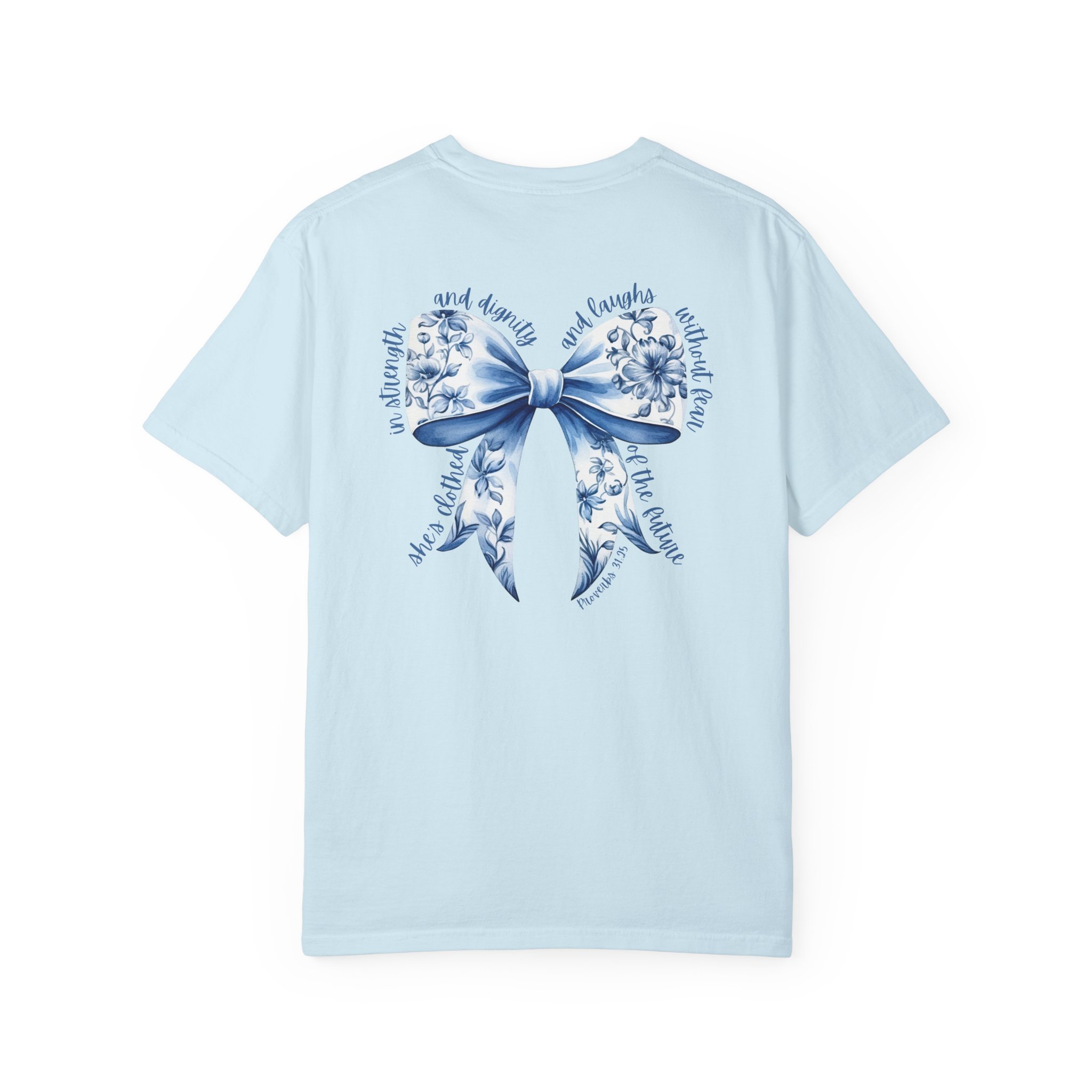 Floral Blue Ribbon T‑Shirt — Proverbs 31:25
