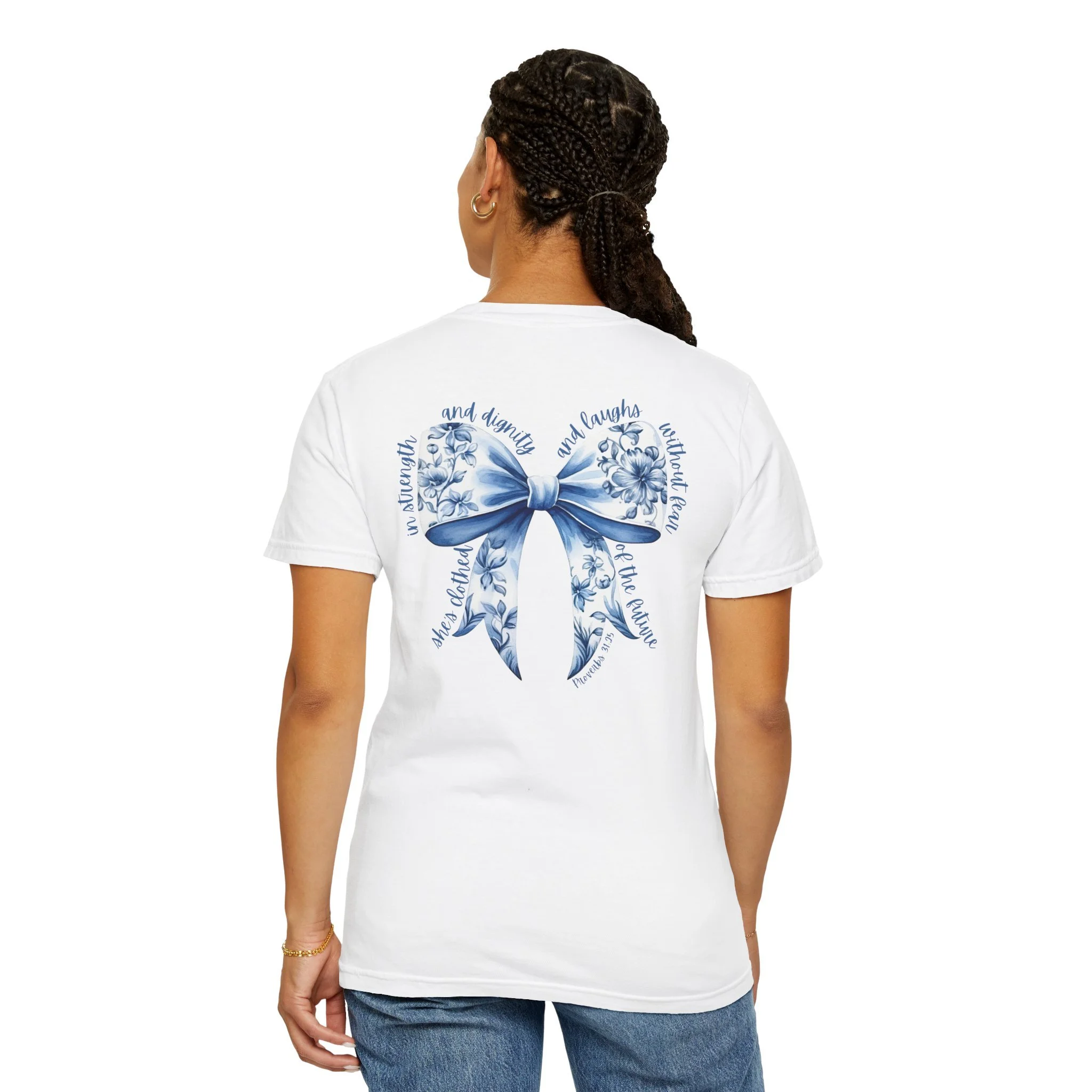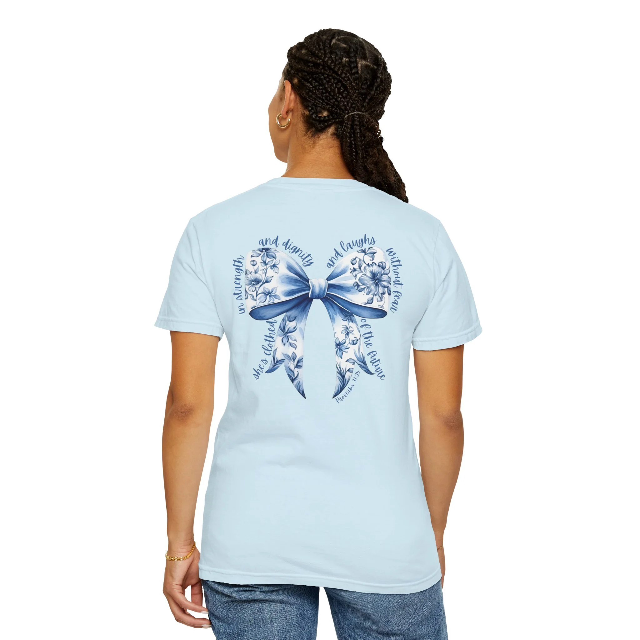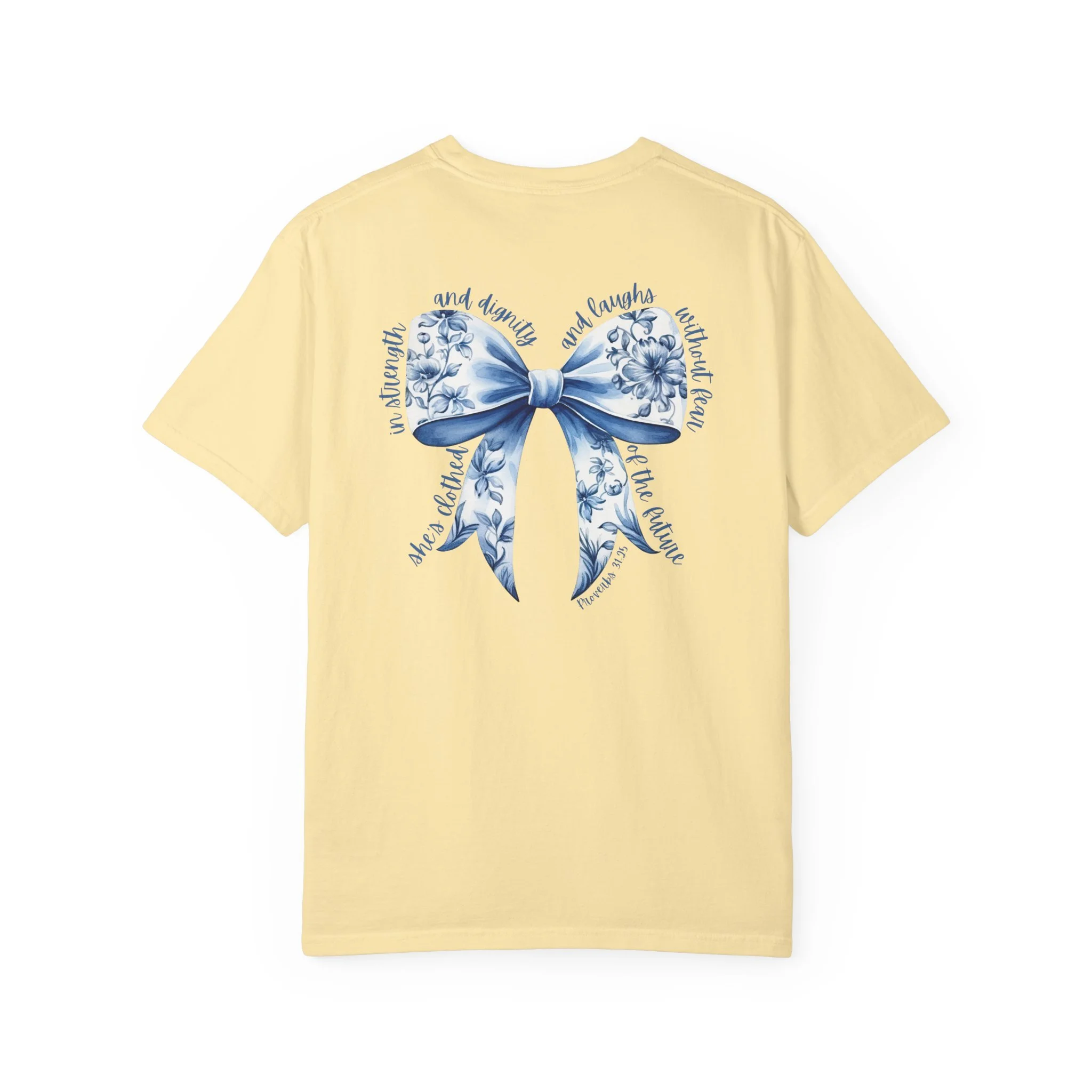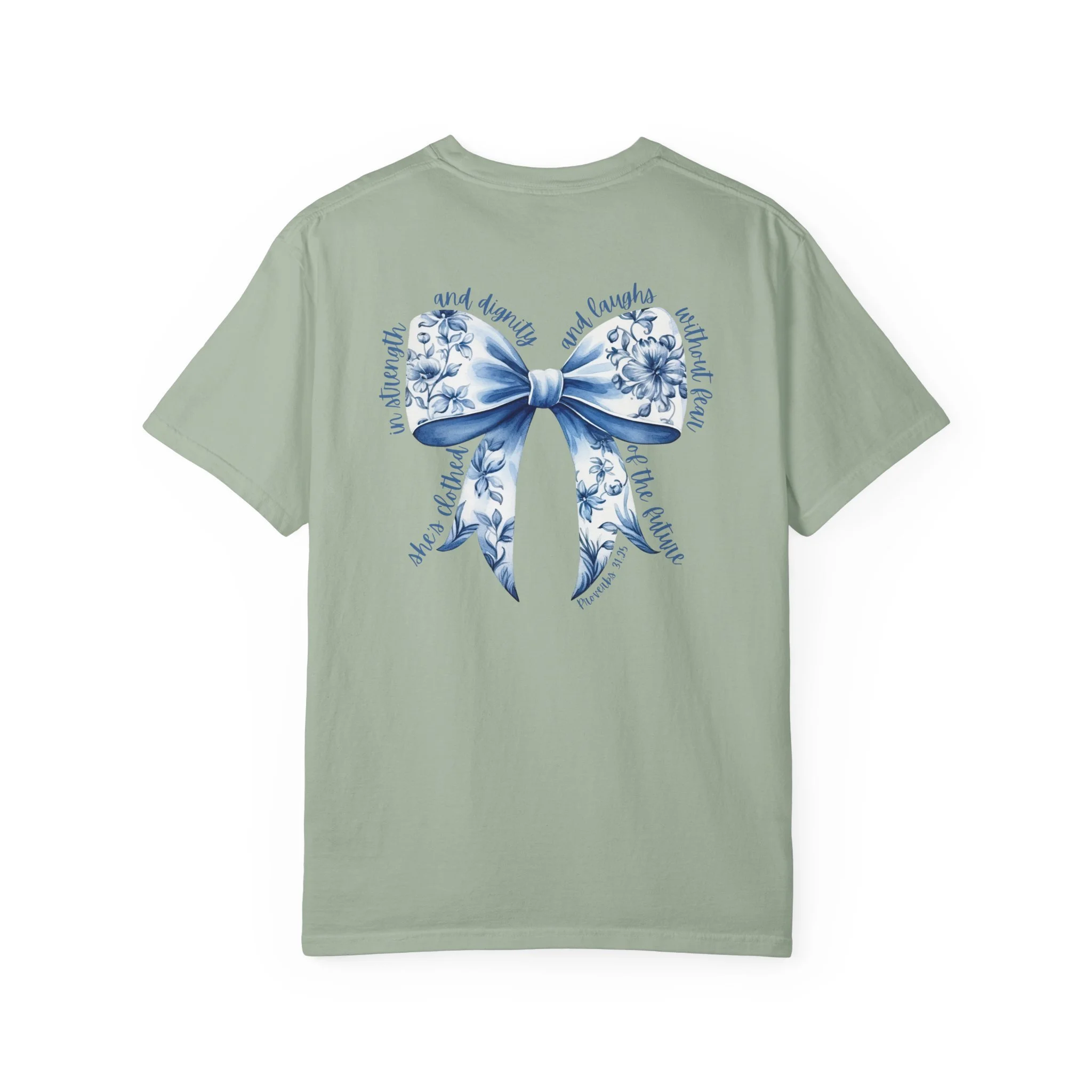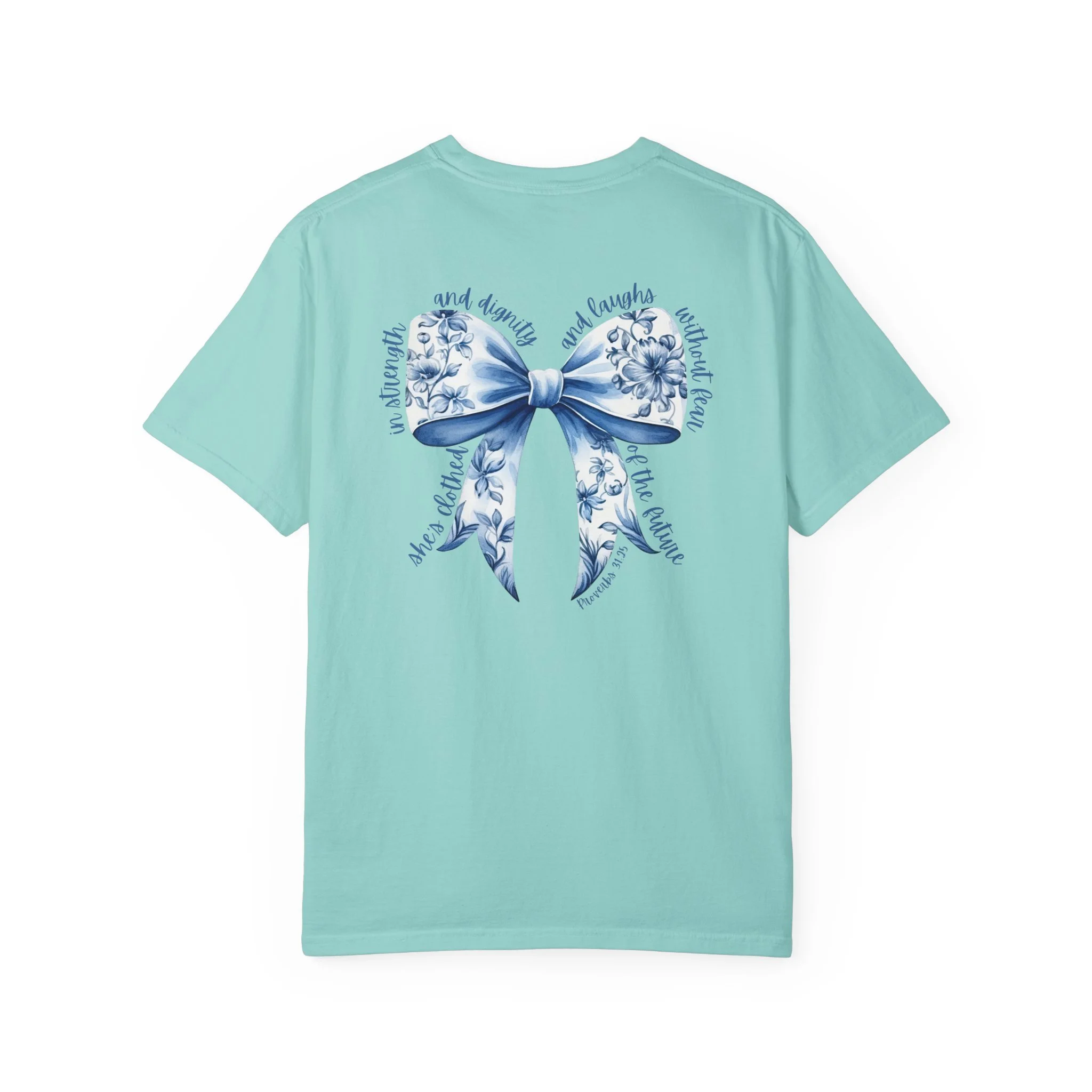 Floral Blue Ribbon T‑Shirt — Proverbs 31:25