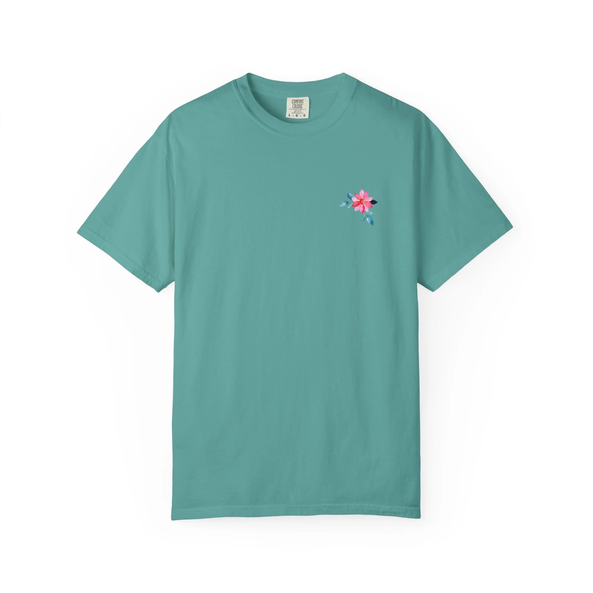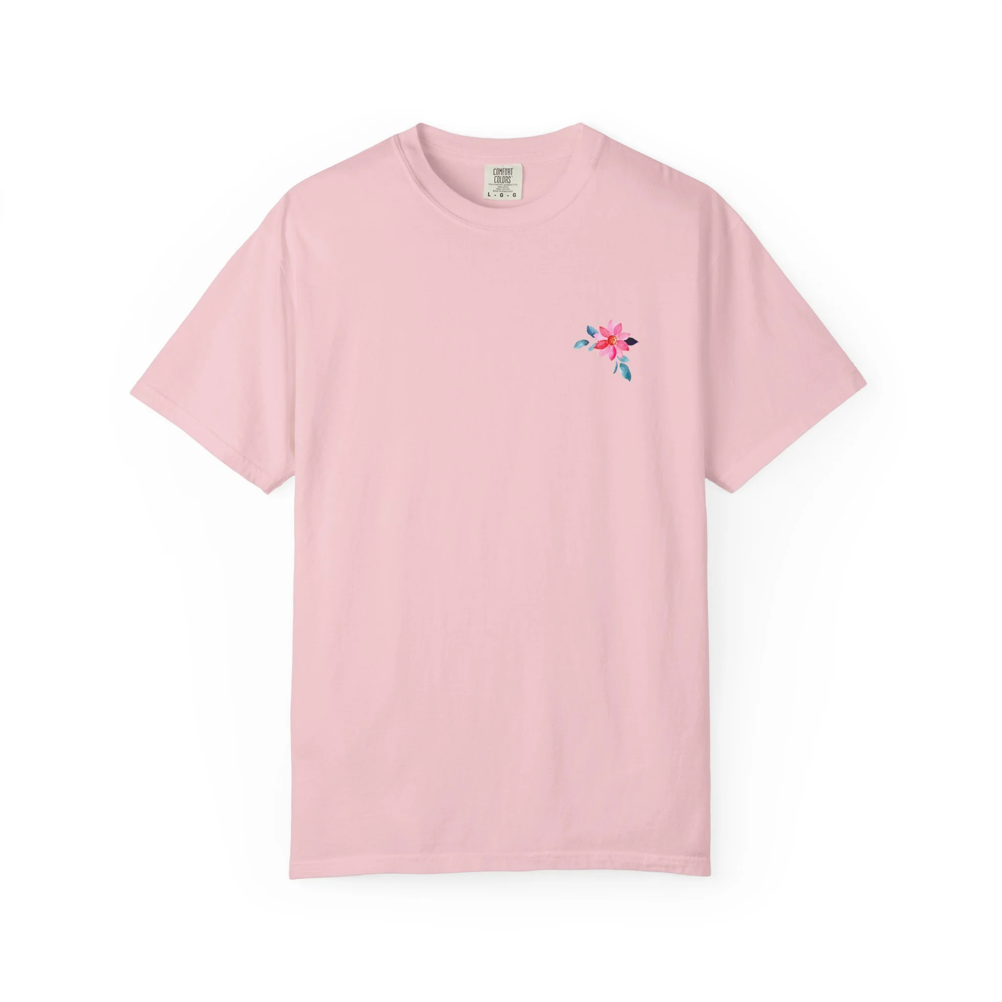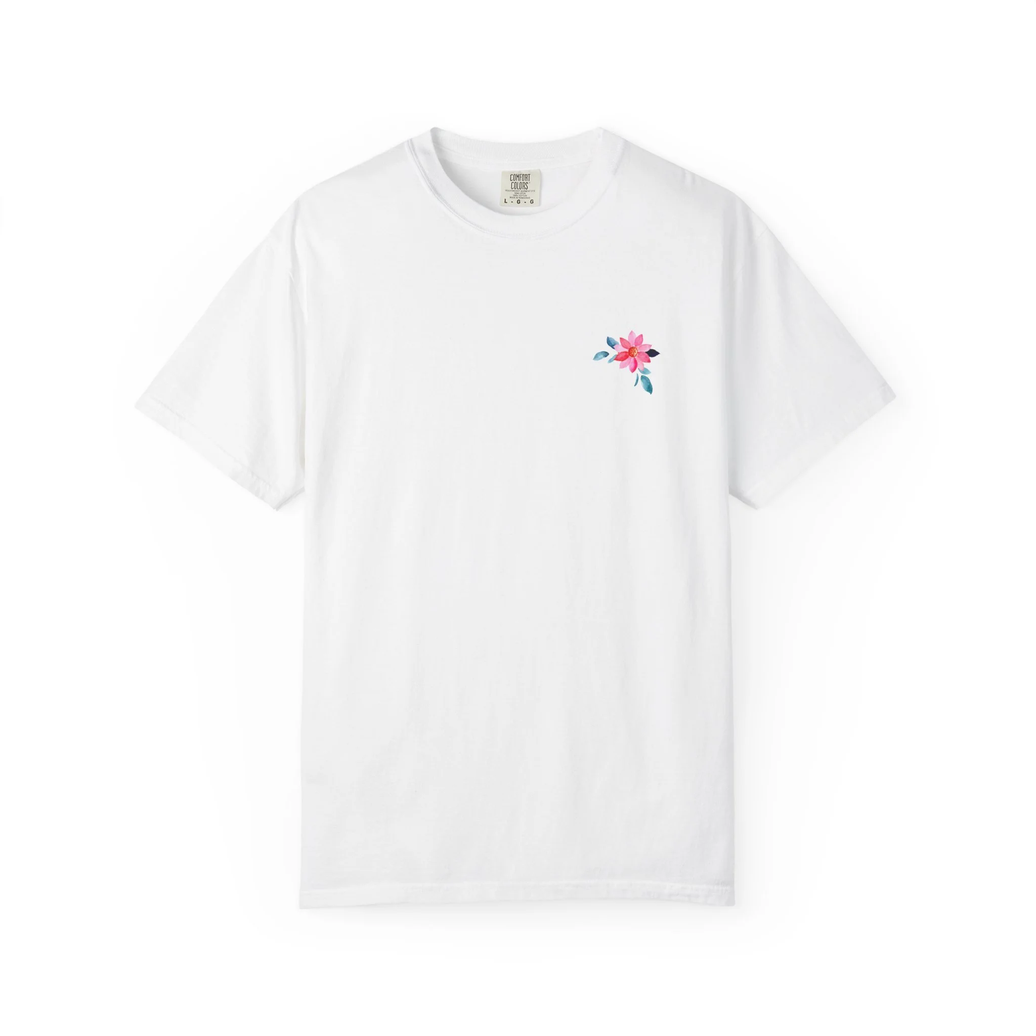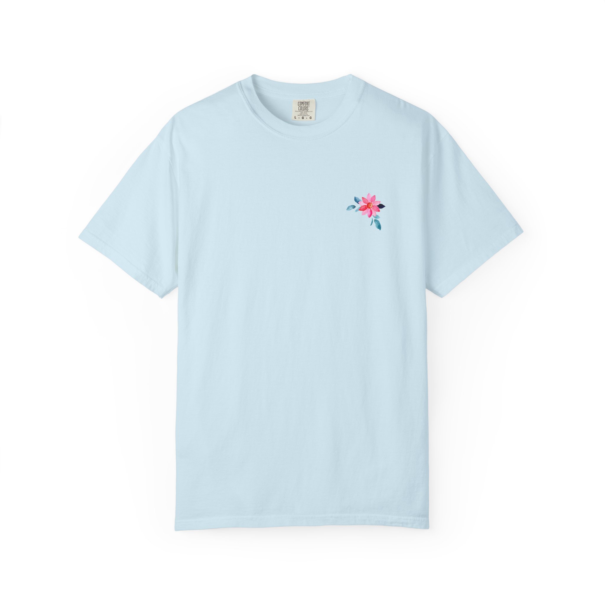 Soft, broken-in cotton with a gentle, garment-dyed wash and a hand-placed floral motif. This relaxed tee sits easily in the wardrobe—layered under a denim jacket, folded on a shelf with linen pants, or worn on a slow morning with a favorite mug. The front carries a small, delicate blossom over the heart; the back opens into a brighter panel of scattered blooms and subtle text that reads like a quiet note. Light, tactile color and a roomy cut make it feel lived-in from the first wear. It’s for people who love understated floral details and clothing that feels personal rather than loud.