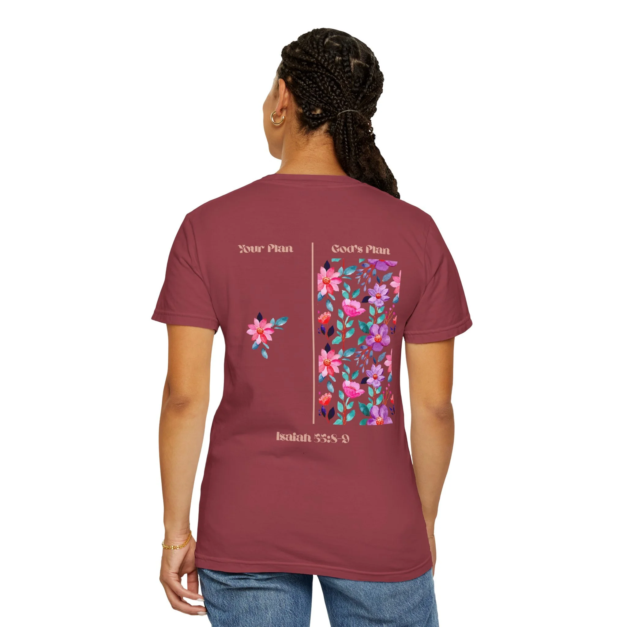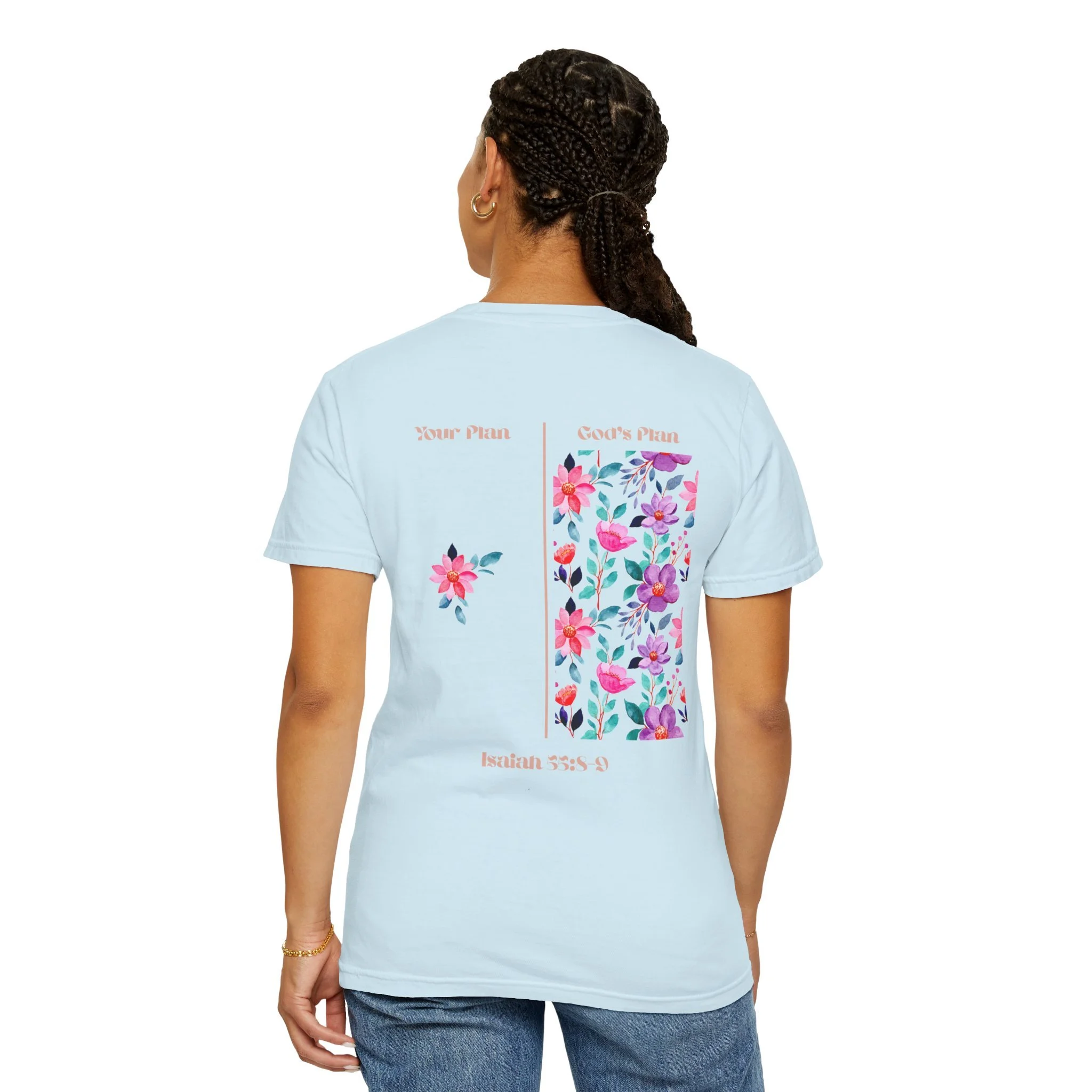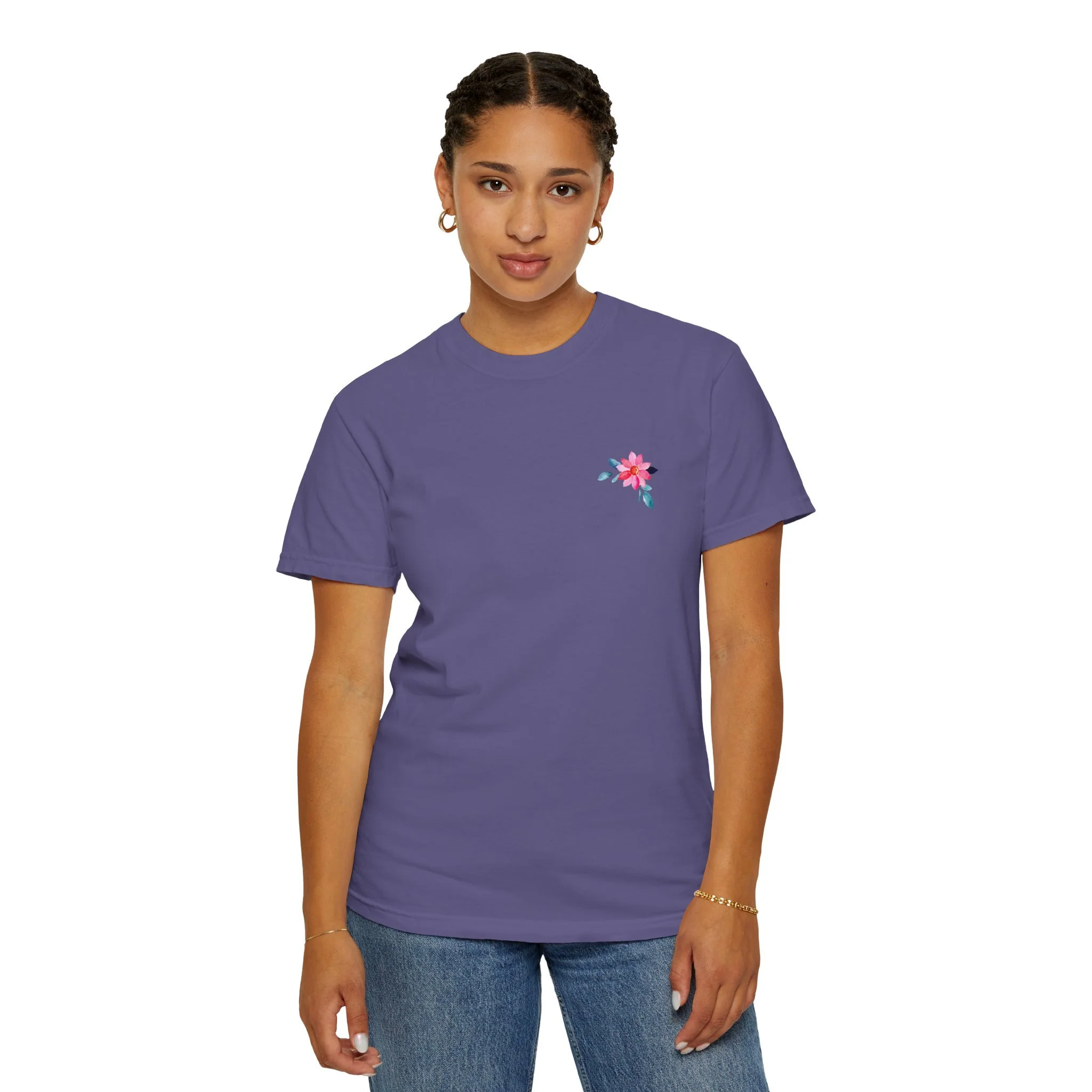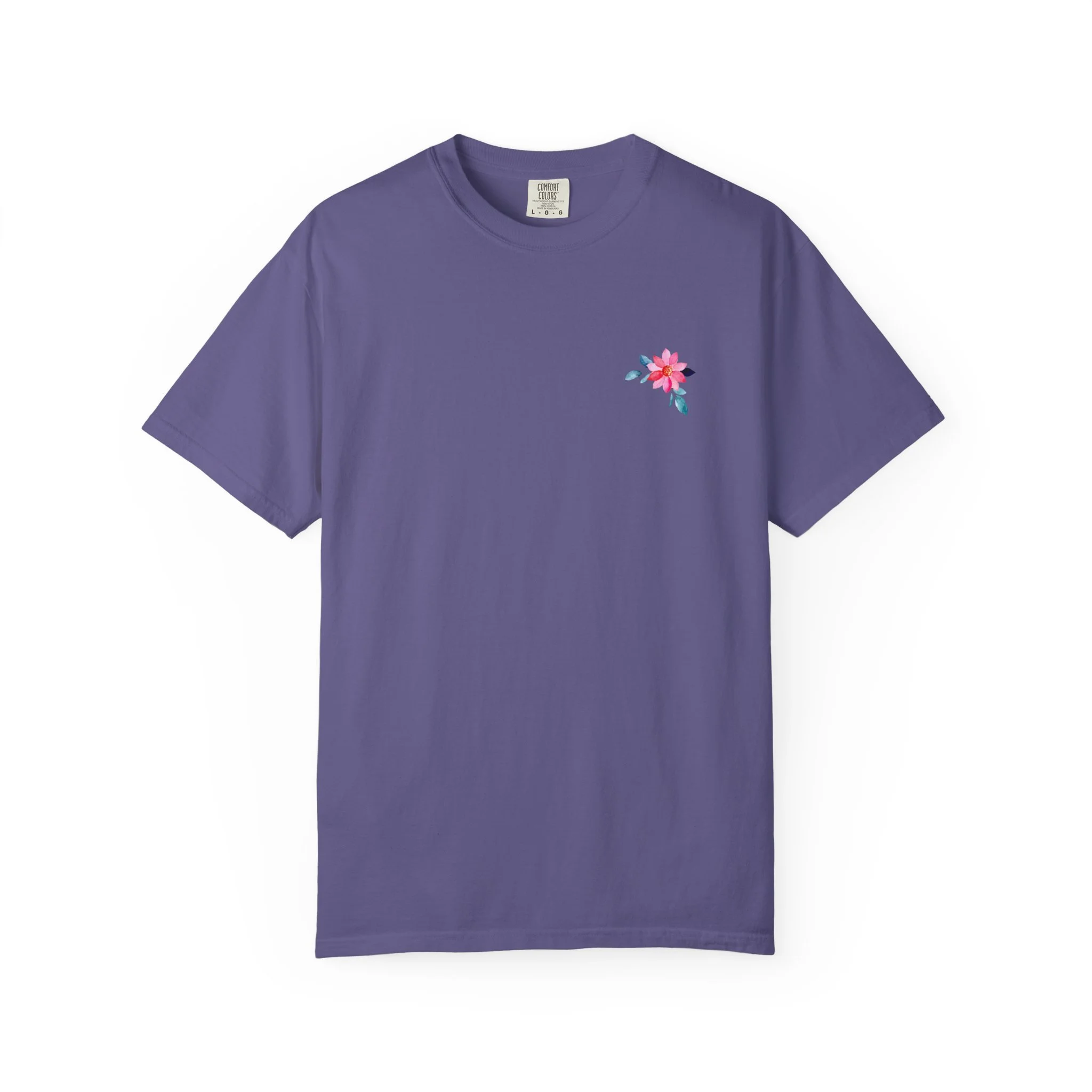 Soft, broken-in cotton with a gentle, garment-dyed wash and a hand-placed floral motif. This relaxed tee sits easily in the wardrobe—layered under a denim jacket, folded on a shelf with linen pants, or worn on a slow morning with a favorite mug. The front carries a small, delicate blossom over the heart; the back opens into a brighter panel of scattered blooms and subtle text that reads like a quiet note. Light, tactile color and a roomy cut make it feel lived-in from the first wear. It’s for people who love understated floral details and clothing that feels personal rather than loud.