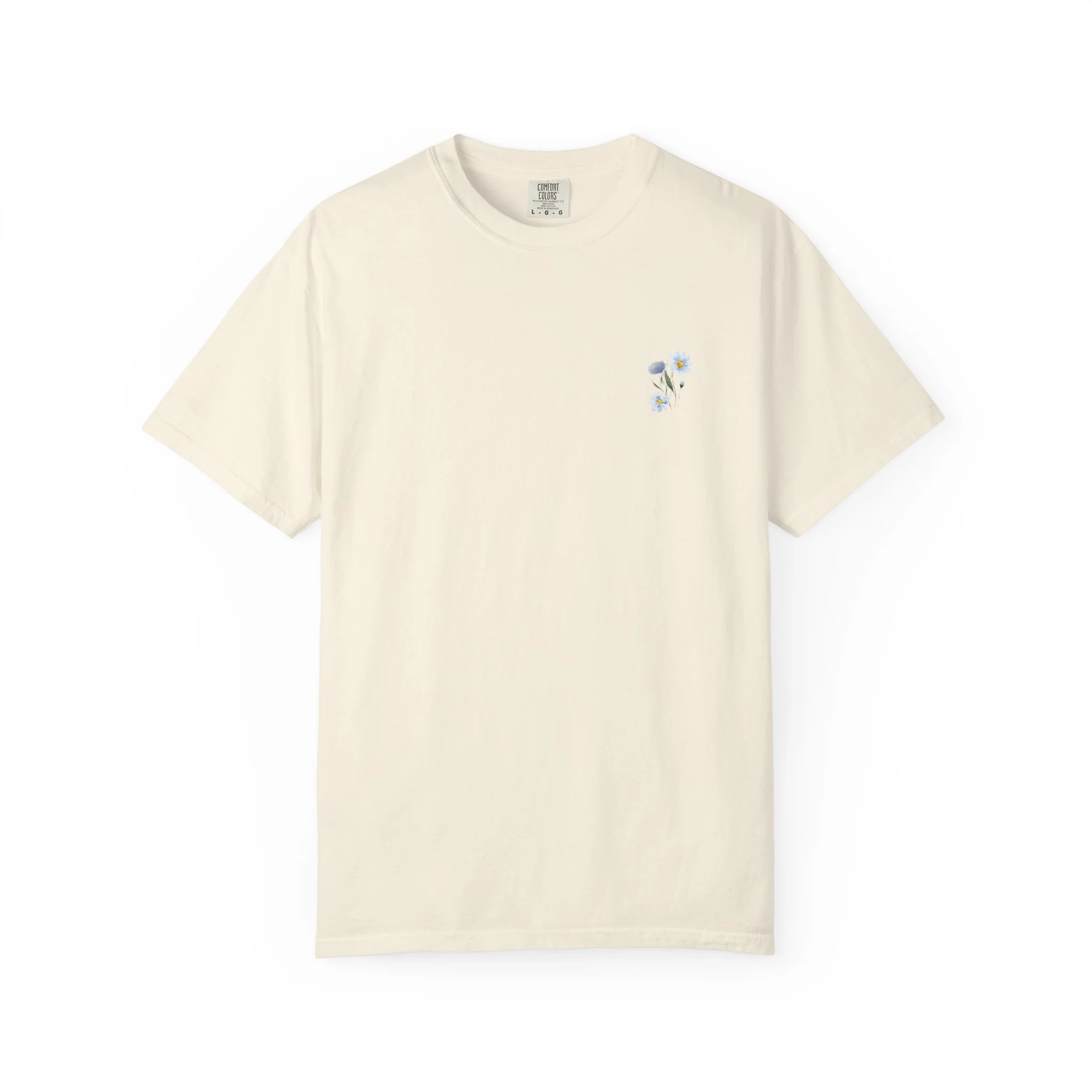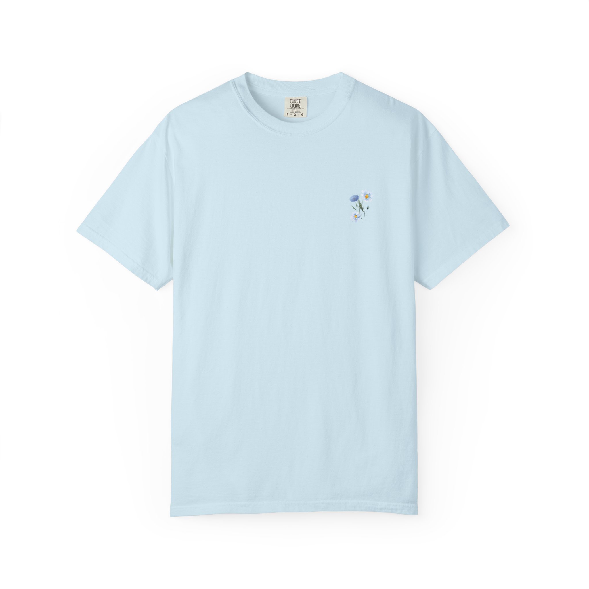 Soft, lived-in comfort meets quiet floral charm. This relaxed-fit T-shirt is garment-dyed for a gentle, broken-in color and worn-in hand that feels like an old favorite from the first wear. On the chest, a tiny watercolor blossom adds a hush of detail. Across the back, a grid of delicate wildflowers—rendered in soft pastels—reads like a pressed bouquet, with a small handwritten phrase woven between the stems. It sits loose over jeans or a linen skirt and layers easily under a cardigan for cool mornings. Lightweight but substantial, the fabric drapes naturally and keeps its shape thanks to double-needle stitching and a pre-shrunk finish. For people who favor subtle, nature-inspired style and quiet, poetic accents, this T-shirt brings a reserved, sentimental note to everyday outfits and small, reflective moments.